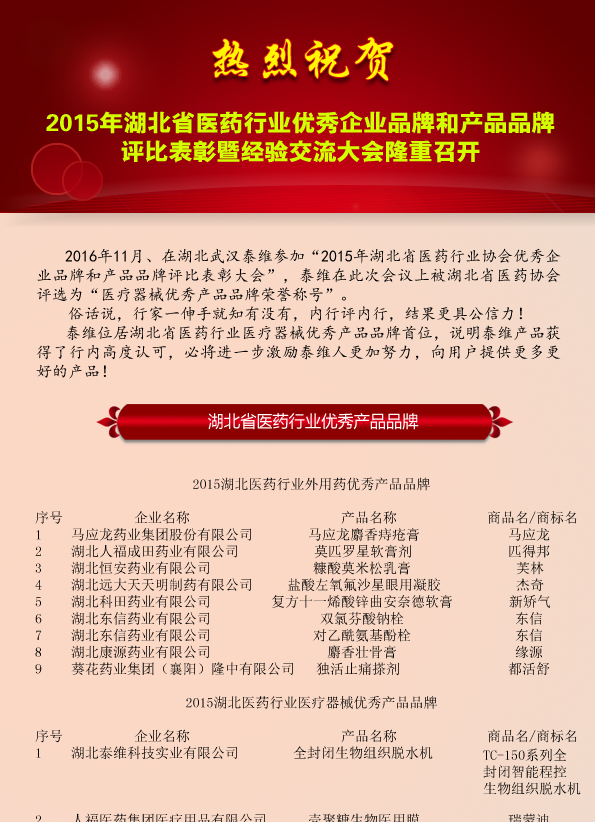 泰維榮獲“湖北省醫(yī)藥行業(yè)優(yōu)秀醫(yī)療器械產(chǎn)品品牌”